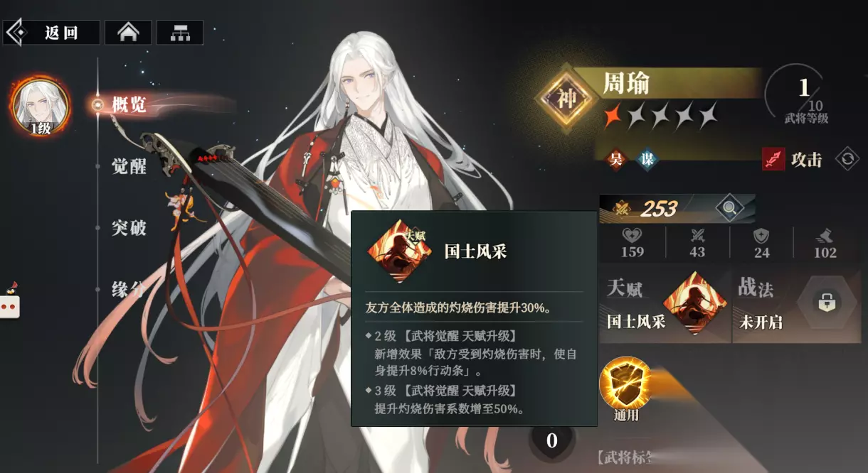 他的天赋“国士风采”是让全体友军形成的灼烧伤害提升30%,升到2级会新增敌方受到灼烧伤害时,自身提升8%进度条的效果,3级会让灼烧伤害增加到50%,他的通用“破甲”会获得10点战意,并使得自身获得1回合破甲效果,破甲能20%无视防御,最多可叠加1层可被驱散。