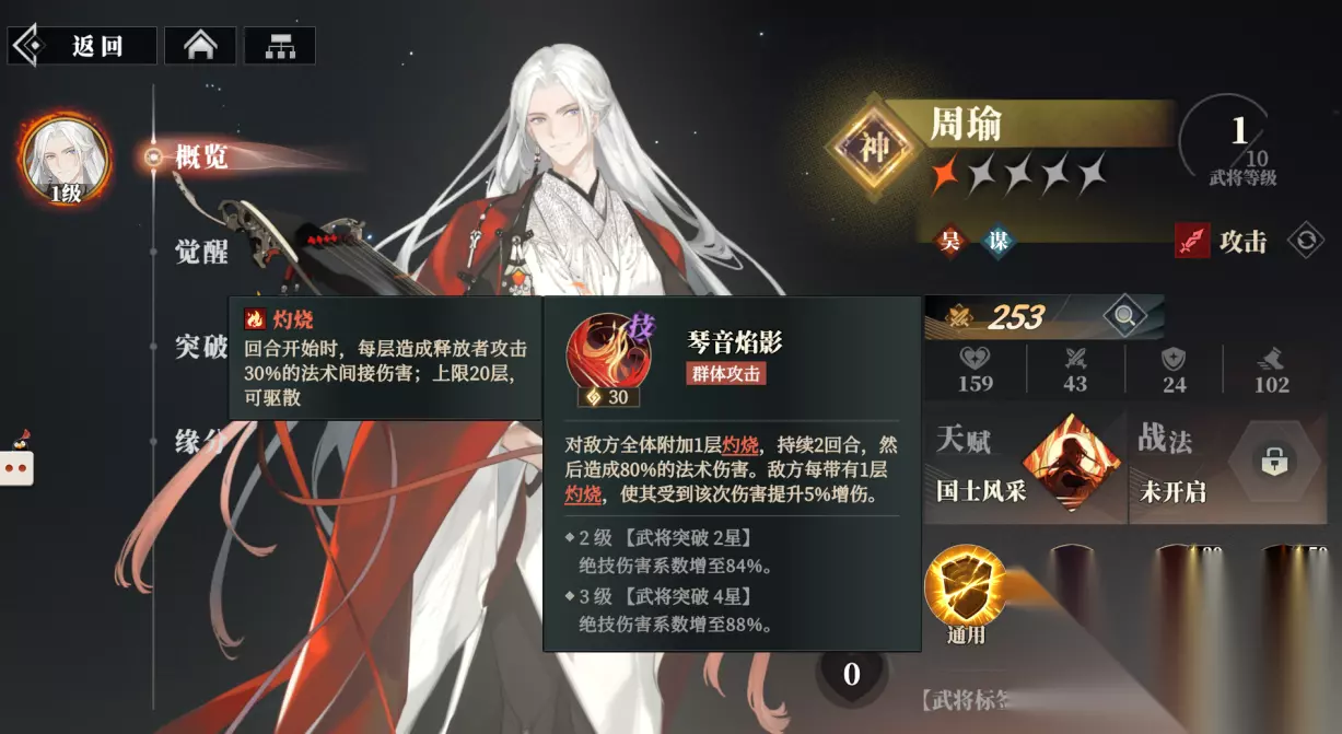 他的绝技“琴音焰影”会对敌方全体附加1层持续2回合的灼烧,然后形成80%法术伤害,敌方每带有1层的灼烧,就会让该次伤害提升5%的增伤,武将升到2星该绝技伤害系数会增加到84%,4星则让伤害系数增加到88%。
