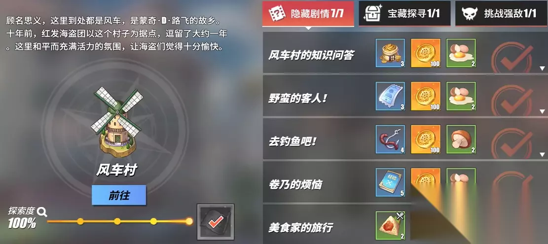 开始风车村的探索得先确保自己的游戏角色等级达到22级,这样主界面右上角的地图才会解锁世界探索的入口。点进去选择风车村就能正式进入这片充满惊喜的初始地图了,整个探索过程简单来说就是和那些头顶紫色感叹号的NPC挨个聊天,然后按他们说的去做。这里有七个主要的隐藏剧情任务,还有一个需要按顺序开启的宝藏探寻以及一次强敌挑战,把这些全部搞定你的探索度就能达到百分之百。作为新手接触的第一个探索地图,它的设计非常友好,任务流程大多是跑腿、对话和小型战斗,难度不高但奖励不错,能让你熟悉这种边逛地图边听故事边拿奖励的独特玩法。