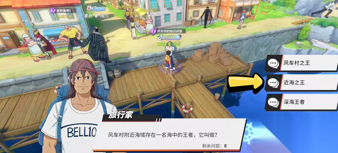 然而你鼓励小男孩想当海盗的举动惹恼了他的母亲,这位烦恼的妈妈就在风车附近,她会气呼呼地让你去村里的杂货店买一瓶牛奶来作为小小的惩罚。杂货店的位置可以打开小地图查看,花3600贝利买好牛奶交给她就能平息她的怒火并拿到奖励。除了这些有人物故事的任务,村里还有些纯对话的轻松环节,比如在生活区岩石壁下能找到一位美食家,跟他聊聊天听他讲讲美食见闻,不需要任何跑腿或战斗就能完成任务拿到鸡蛋和粽子。码头附近还有一位鱼店大婶,她会请你帮忙让鱼店大叔能出海,而关键是要找到修船的木材。木材的位置在菜地后面那架高高的风车旁边,找到那棵可以砍伐的树采集到木材后,回去交给鱼店大叔。大叔会很高兴地带你去秘密地点钓鱼,期间还会问你关于曾经到访过的大海盗是谁,答案是杰克斯。