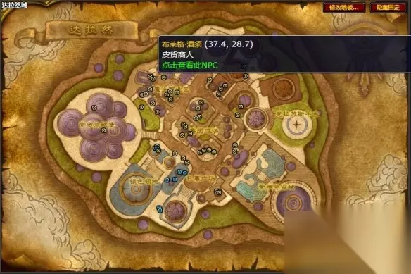 达拉然皮货商人位置: 1、前往魔法商业区的37.4,28.7坐标位置就可以找到皮货商人。