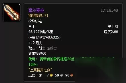 囧王者这里先不回答这个问题,先来介绍下这整个有关任务线。《弗洛尔的屠龙技术纲要》是厄运之锤所有的BOSS都有0.3%的几率掉落,而这本书能触发一个战士和圣骑士的专属任务,任务奖励为单手剑"奎尔塞拉",属性如贴图所示,因为特效激发后,佩戴者可以获得防御值和300点护甲,持续10秒,可以说是团队防御战士和防骑的必备武器。而完成任务也非常麻烦,除了拿到书接到任务,还要到厄运图书馆不停的交任务,最后任务是"铸造奎尔萨拉",需要到奥妮克希亚的巢穴击败黑龙妹妹时插到地上才能最终得到这把剑,可以说整个任务过程既费时又麻烦,但对于一个战士和圣骑士T来说,却又是一种荣誉,也就是只要有可能,都是非做不可的任务。