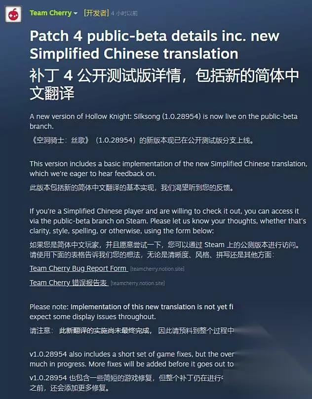 开发商Team Cherry宣布,《空洞骑士:丝之歌》的最新版本(v1.0.28954)现已于Steam公测分支上线。此版本新增了简体中文翻译的基础版本,不过鉴于目前该版本仍处于测试阶段,当前的翻译内容仅供玩家参考,正式版本发布时仍有调整的可能性。
