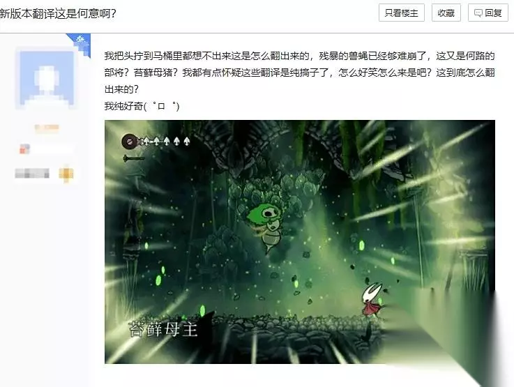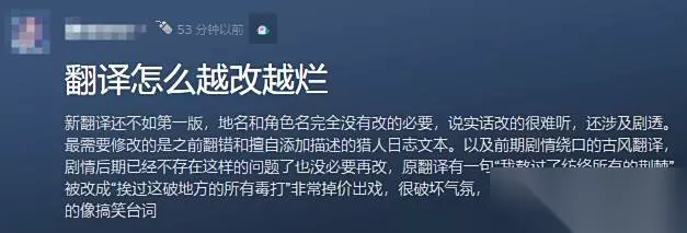 例如,“苔藓之母”被改成了“苔藓母主”,“次席戍卫”则变成了“二号戍卫”。还有玩家举例吐槽称:“原本‘我熬过了纺络所有的荆棘’这句翻译,被改成了‘挨过这破地方的所有毒打’,这让人感觉特别掉价,而且十分出戏。原本严肃坚定的语气,瞬间变得像搞笑台词,严重破坏了游戏的整体氛围。”