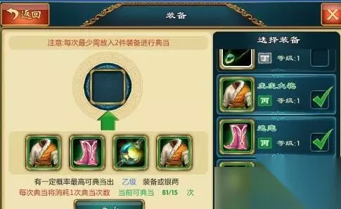 刷装备技巧: 1、通过上图和下图大家可以看到当用绿装时是有几率是蓝装的,用白装则最高只能出绿装,后期预估会开放蓝装典当有几率出紫装和技能或者阵法典当。 2、小编经过实测典当4件绿装没有强化过的典当一次是获得9万多的银两,也有几率获得乙装当然这个概率非常小。 3、原创小编绕指柔经过实测70次典当绿装出了两件乙装,当然也收集了群内一些玩家的爆率,一般可以固定在70次出一件蓝,如果有偏差只有两种可能一个是人品爆棚,一个是脸非常黑。 4、小编在这里和大家提个醒典当最好不要用白装,第一是因为白装最高也只能出绿装就算要钱我相信大家不会缺那么一点钱的,第二是因为白装在招贤榜中是热门物品。 5、至于典当用几件装备好这个问题小编认为还是四件吧省次数钱也多点。 6、典当的最佳时间:小编认为在中午和和下午下班或者吃饭结束后最佳,这种拼概率的东西就需要在人多的时候去碰不要挑冷门时间。