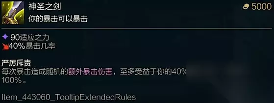 二、效果 【严厉斥责】 每次暴击造成随机的额外暴击伤害,至多受益于你的40%暴击几率,可超过100%。 三、分析 数值较高的暴击输出装备,适合平a流的英雄去选择,另外有一些刺客英雄也可以搭配神圣之剑来提高自己的爆发。