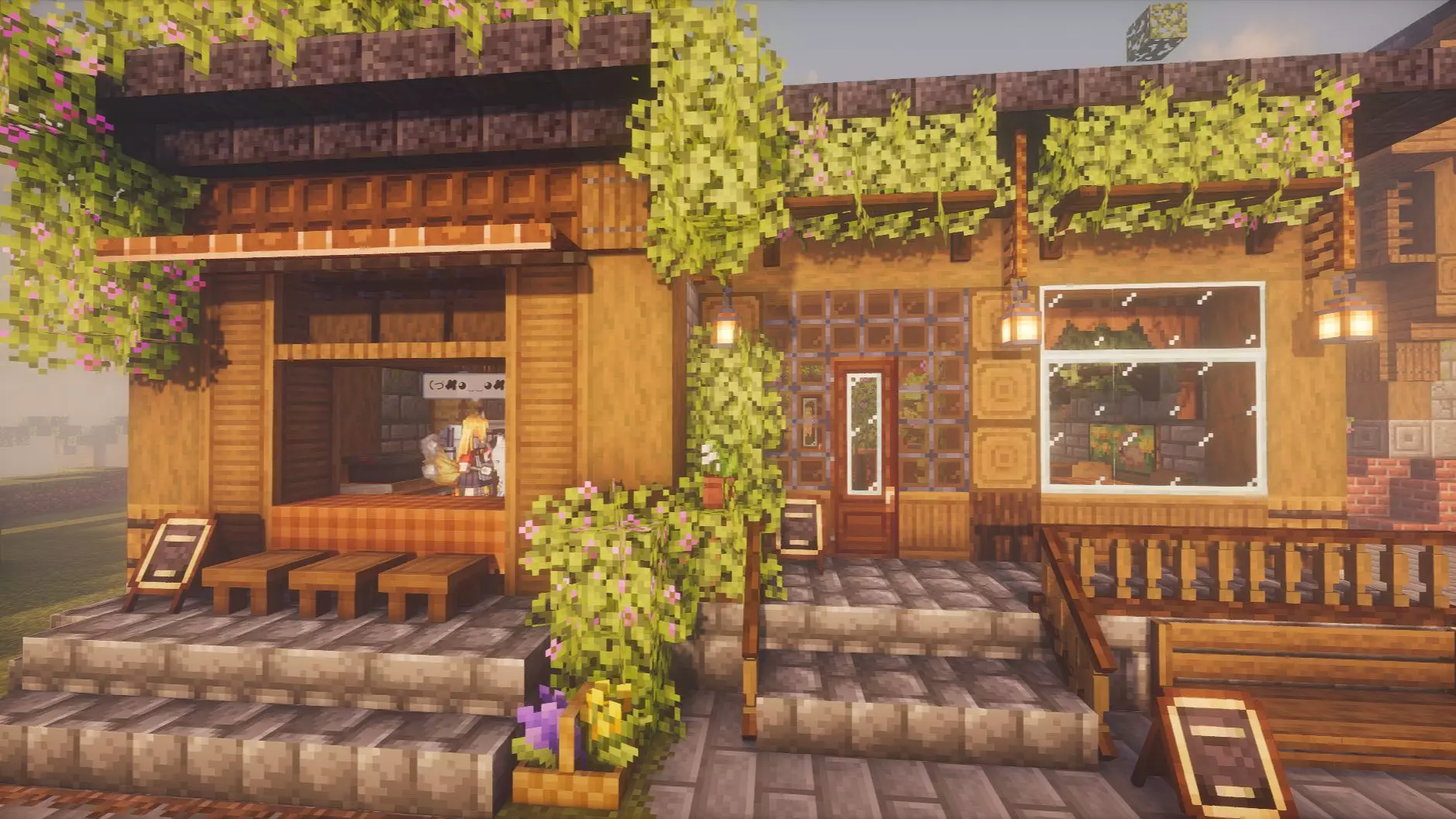 这是《我的世界》多人联机的囡囡小镇二周目内容,展示了小镇升级后的新建筑,包括精致的室内用餐区、户外烹饪区、猜灯谜场景、特色种植区以及果子部落区域等,呈现了丰富的小镇建造内容。