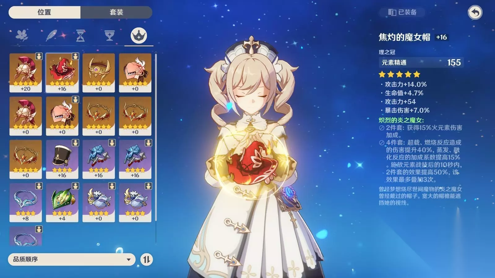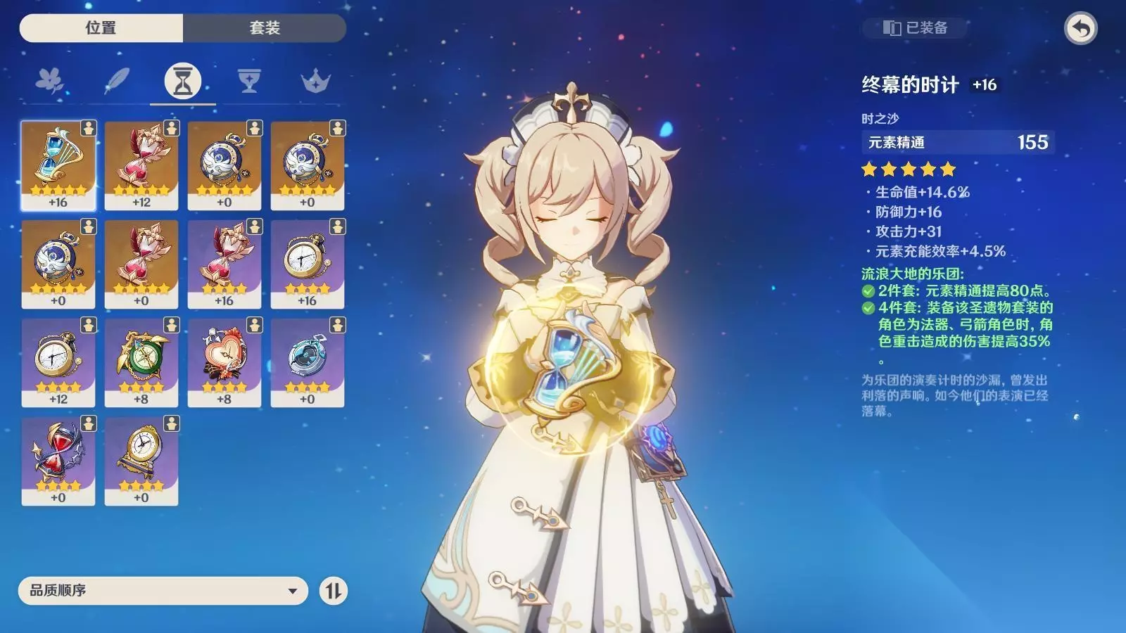 时之沙:主属性元素精通 精通高于400 主属性选攻击 副属性同上