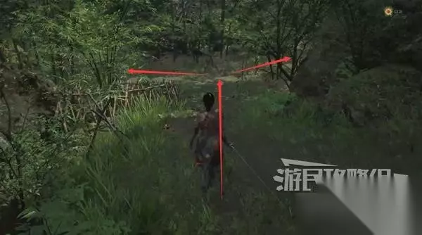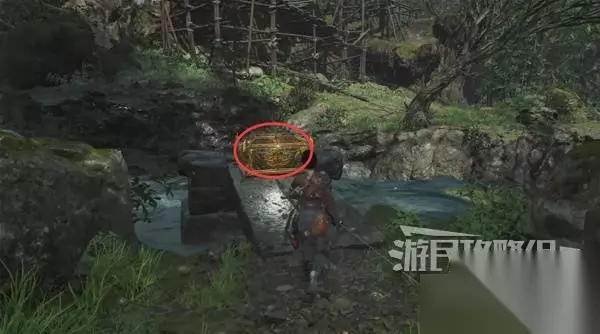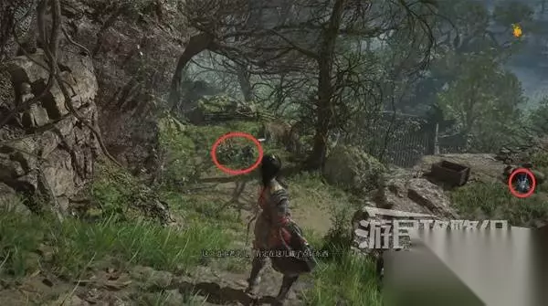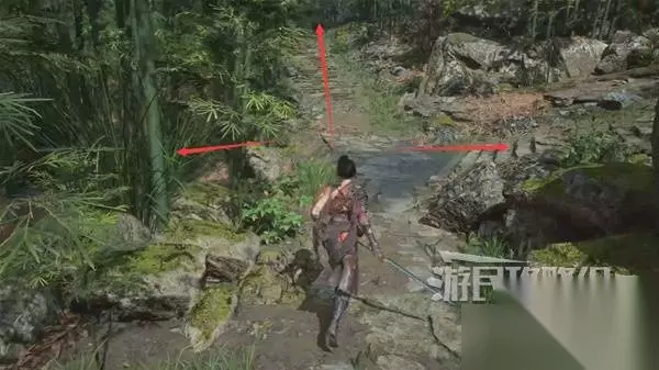 继续往前走,干掉一个敌人后,前面有个岔路。 先左拐下去,在河边有东西捡,然后回来继续往前走。