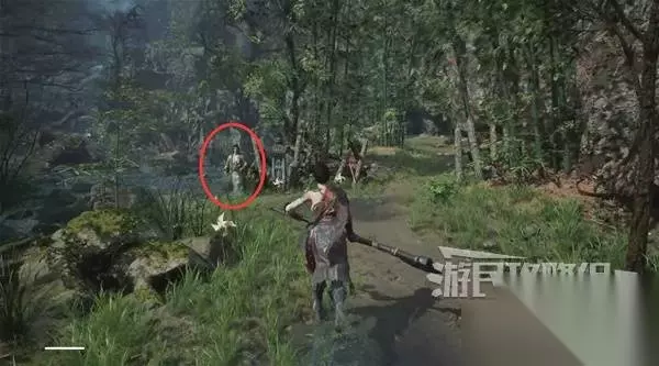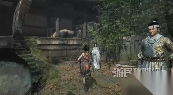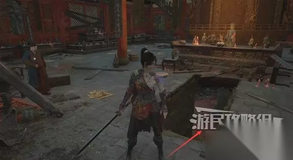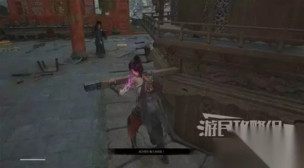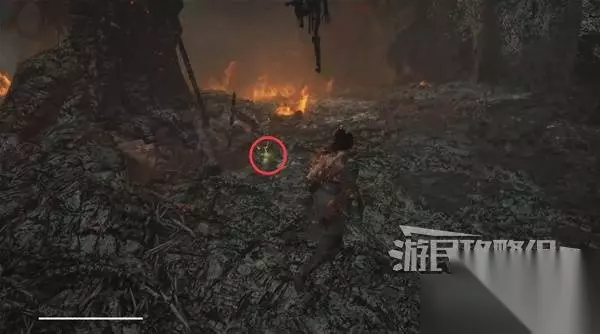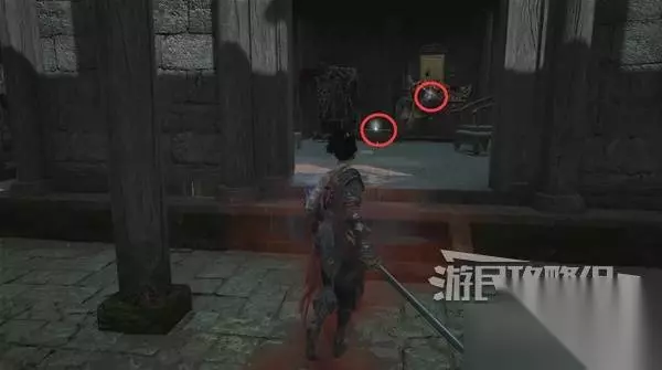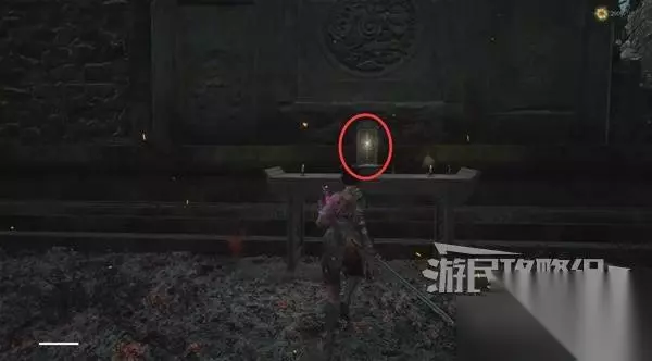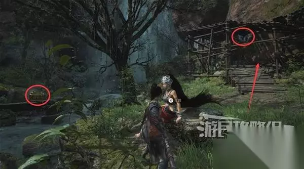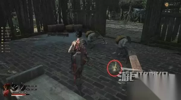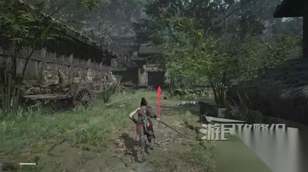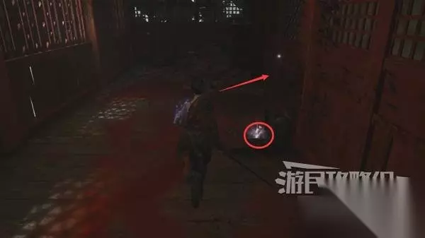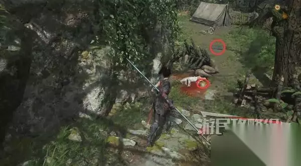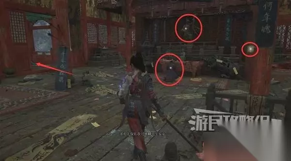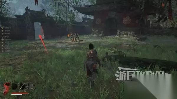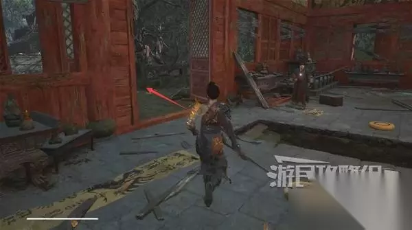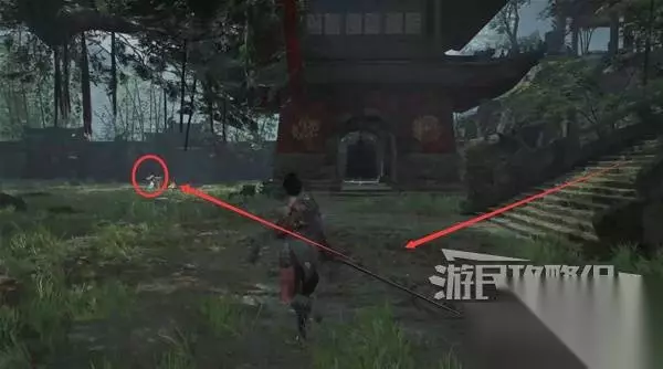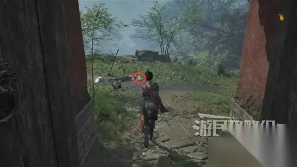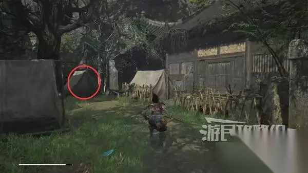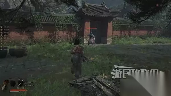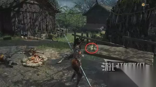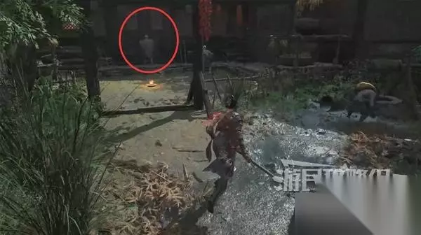 寺院现在有了一些敌人,调查并搜刮下整个院子,大树旁地上有个巨大抓痕。 左边有个明军士兵守着门,需要以后获得普元寺钥匙才能开门。小心明军比普通敌人更强,击败明军士兵获得【黯淡红羽】,用于升级武器熟练度。 面前的门只能从另一面打开,先不管。 调查并搜刮完院子后,去右边出门离开。刚才遇到老船夫的篝火旁,有两个敌人。