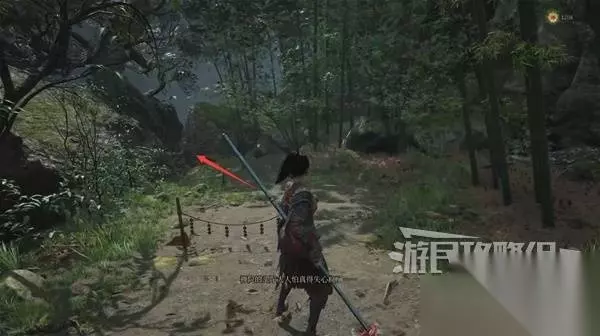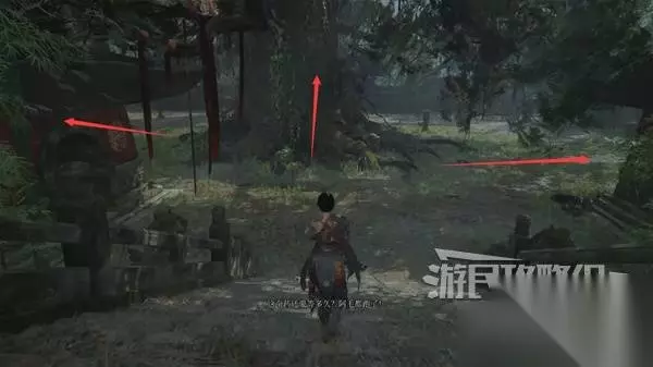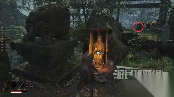 站在神龛处,可以看到障碍物那边有个小孩,等下我们从另一边过去找他对话。