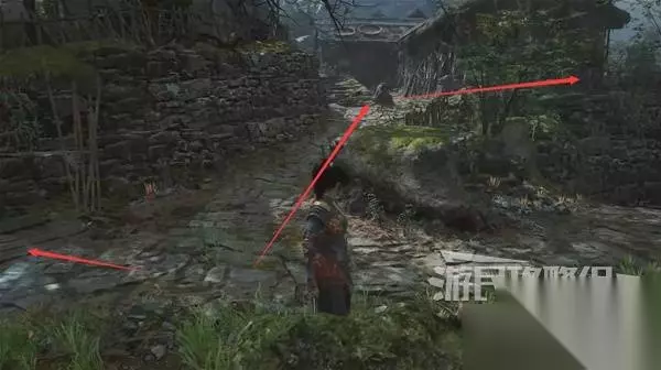 在房子后面的走廊,有个敌人会冲破房子偷袭你,到房子里开盒子拿到【先神之言】未·反击。 从走廊往右边下方看,发现下面就是刚才前往熊猫的那条路。