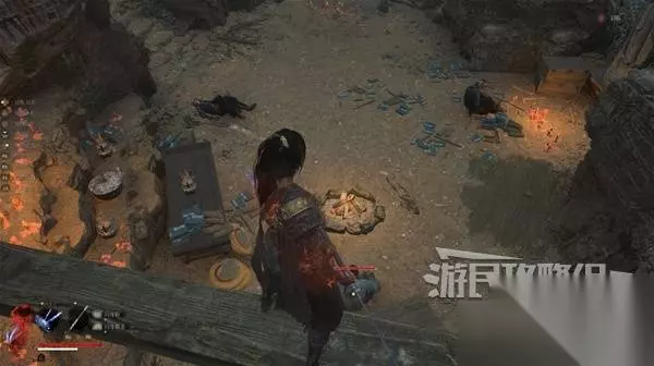 搜刮两侧的房子,院子右侧的房子里,开宝箱拿到【羽族遗骸】。在技能加点时,用于升级血瓶恢复效果。 搜刮完院子,然后继续往前走。