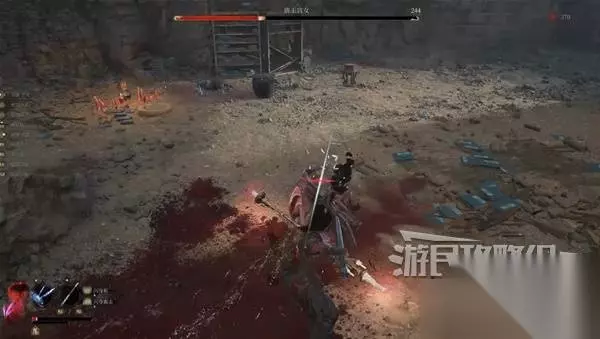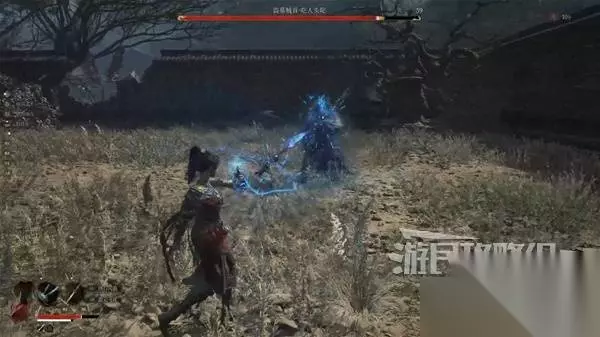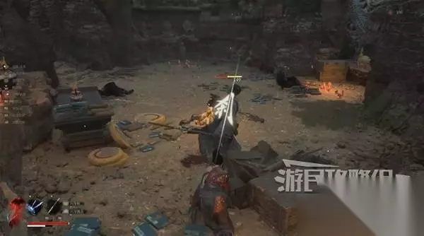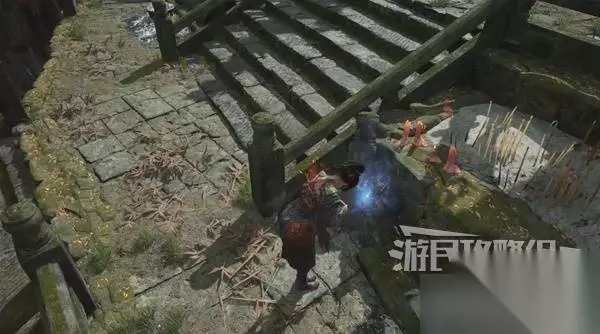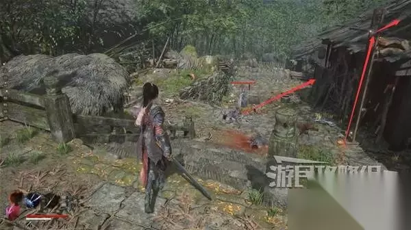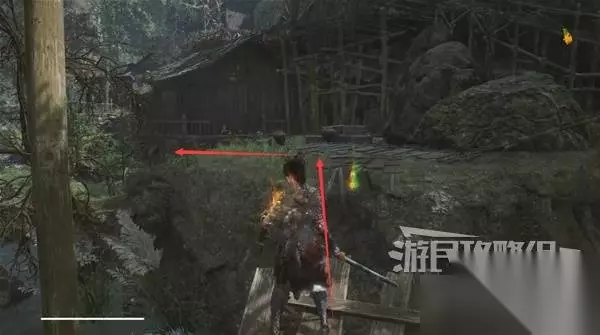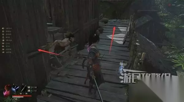 然后站在敌人头顶,从木杆上往下跳。在下落时使用轻攻击,发动下落攻击,可对中小体型人形敌人造成破刹。 对敌人造成破刹后,从敌人的背后或正面使用轻攻击即可发动处决攻击,造成大量伤害。 注意下面有两个看似是尸体的敌人,攻击他就会动起来。从背后使用蓄力重攻击,也可造成破刹。