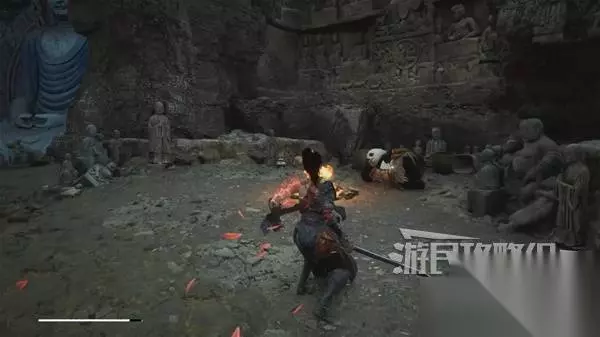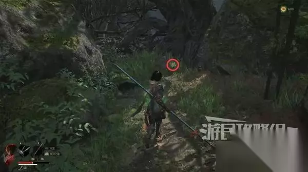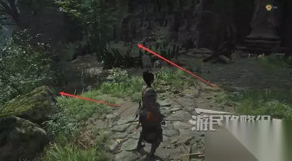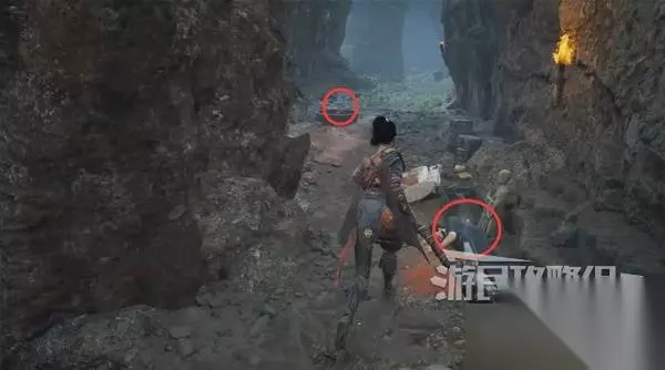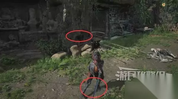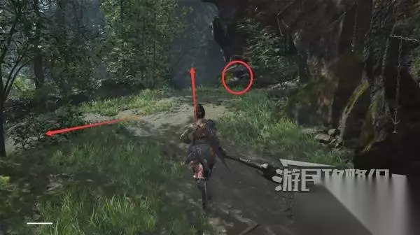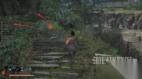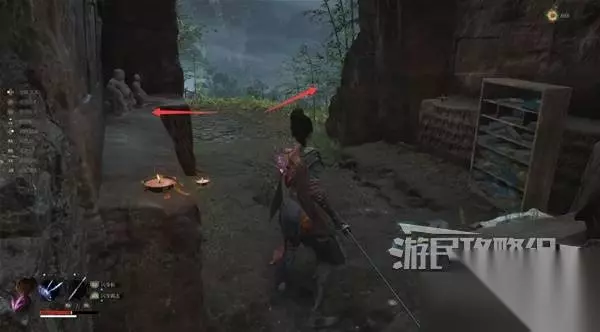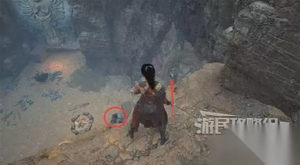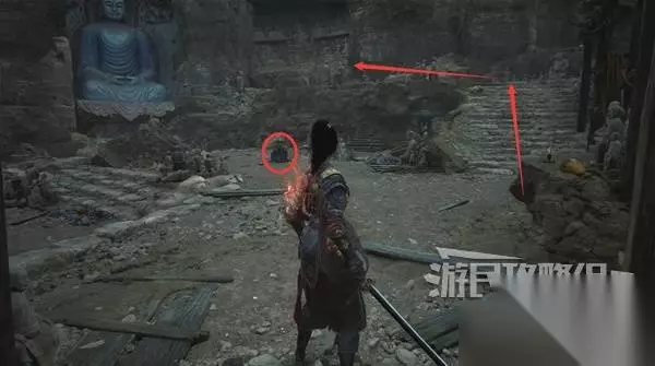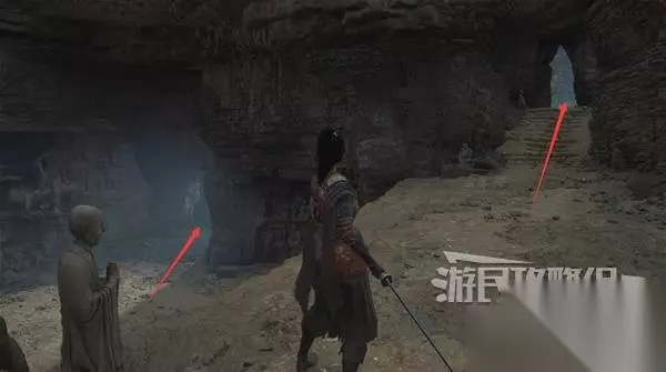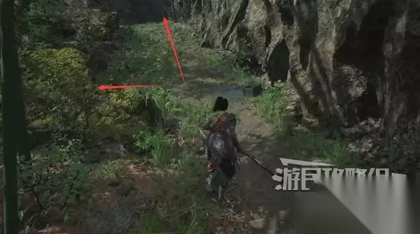 佛源镇-摩崖像 山坡 走出洞,小心左边有敌人埋伏。解决左边的敌人,在左边角落里捡到【黯淡红羽】。