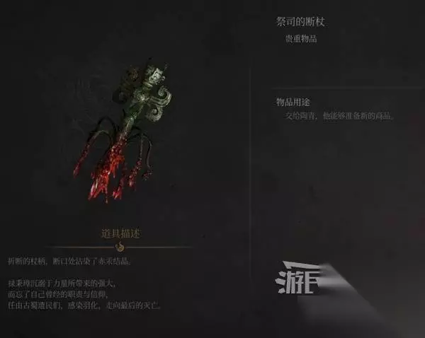 击败“羽化祭司”禄秉璋,得到【贵重物品】蜀王祠钥匙、【贵重物品】不凝血块、【贵重物品】祭司的断杖、【法术】禄秉璋的回响、【先神之言】未·无伤·威力。