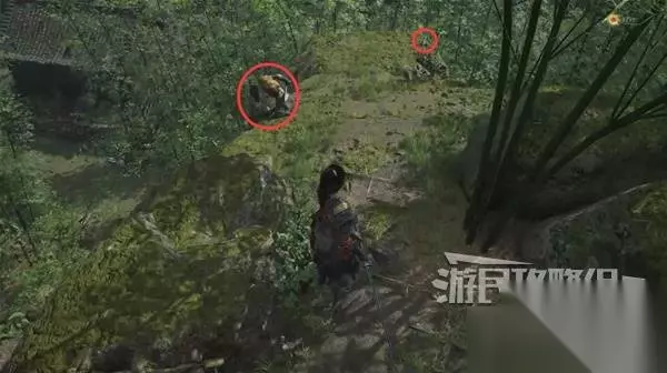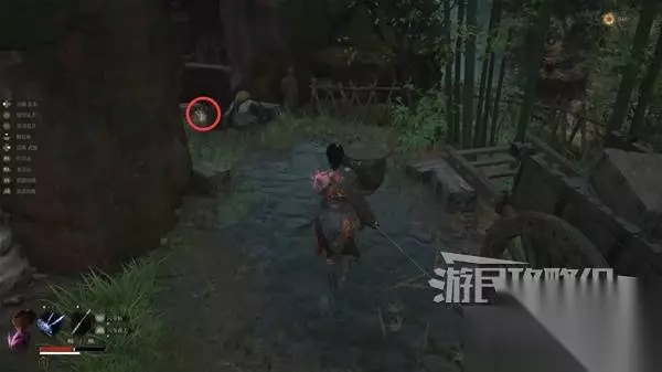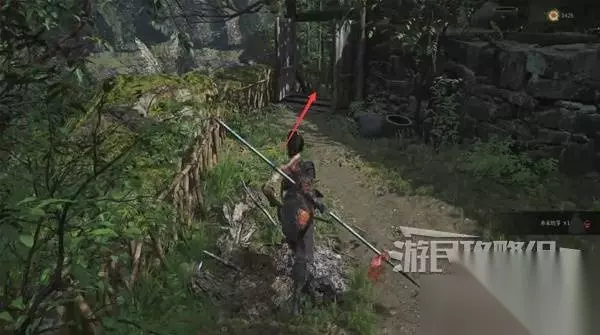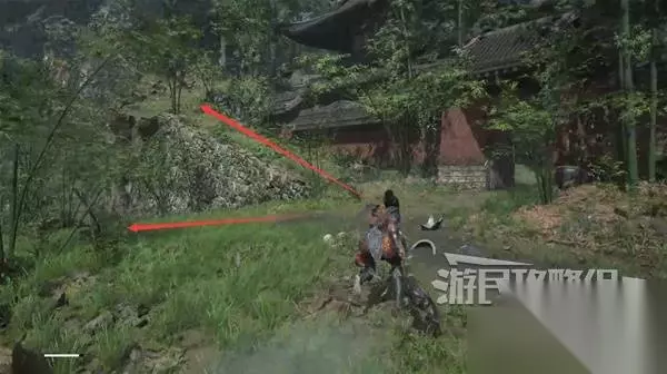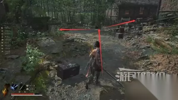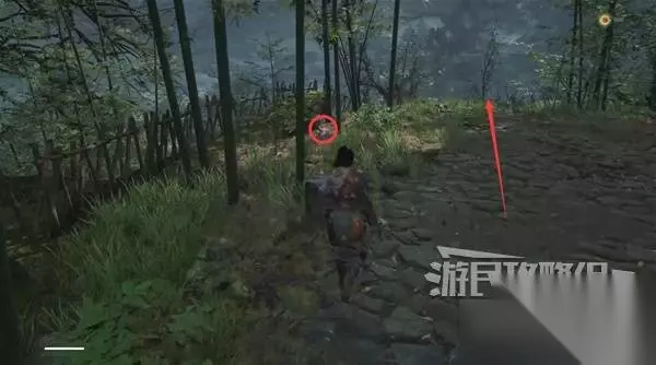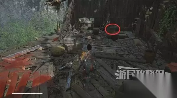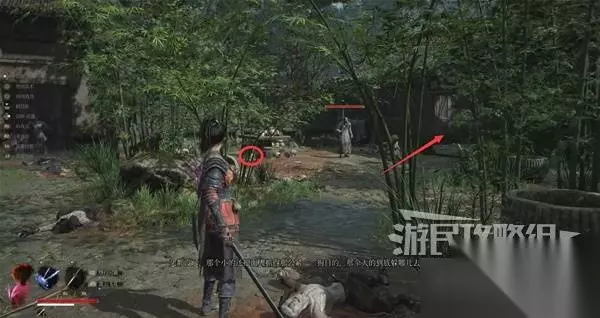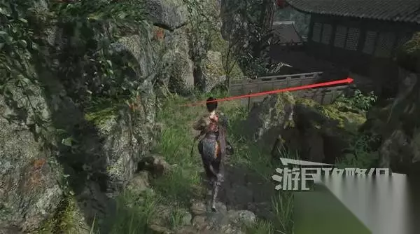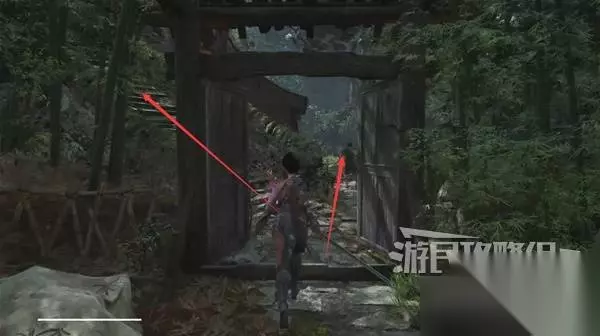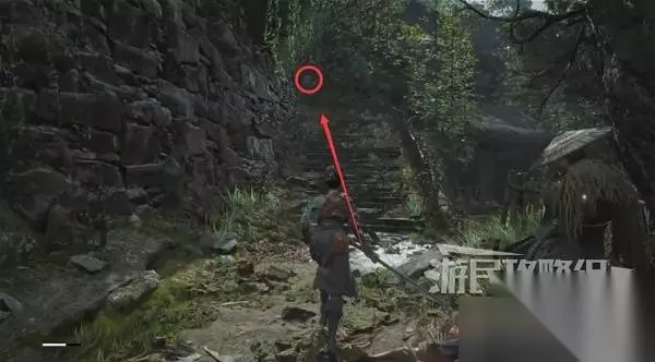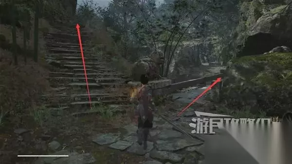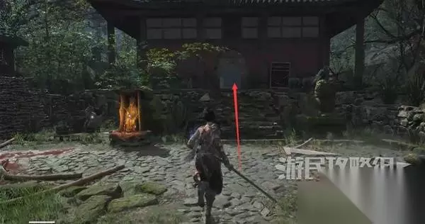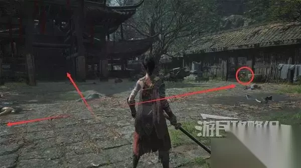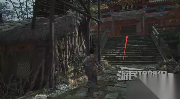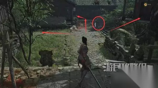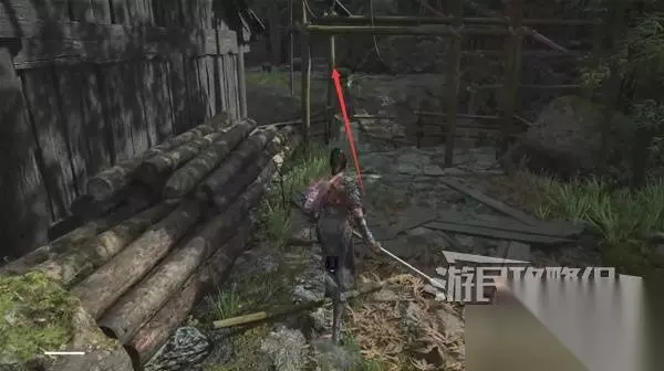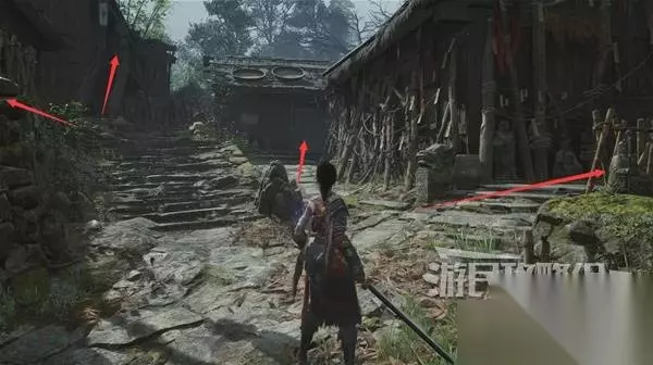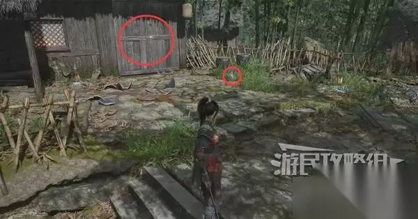再往前来到岔路口,右边上去有个需要从里面打开的门,从高处爬梯子进屋就能开门了,里面没啥好东西,不进也行。 先左拐去竹林小院,等下再回来往前走上阶梯。