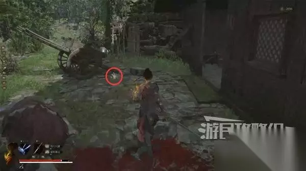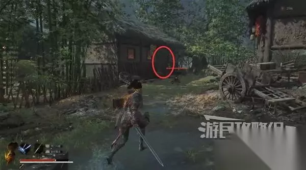 过河后,每层的房子、角落都搜刮下,有不少东西捡。 最上层有个门打不开,需要进了佛源镇后,从另一面开。 沿着河边往前走,有个巨人会从房子里冲出来打你,门外推车旁捡到等长双刀。