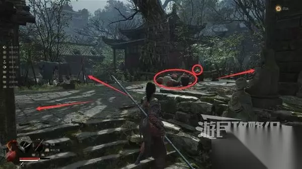 进门捡到火油弹,朝油罐扔火油弹,炸死多个敌人。旁边桌上拿到【单手剑武器】青霜。建议在神龛升级单手剑的“清守御敌”技能,可快速积攒须羽槽,配合远程法术攻击非常好用。 搜刮下两边的房间,左边房间里捡到【玉佩】顽猴玉佩,然后继续往前走,激活含光禅院神龛。