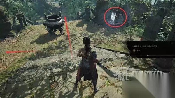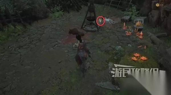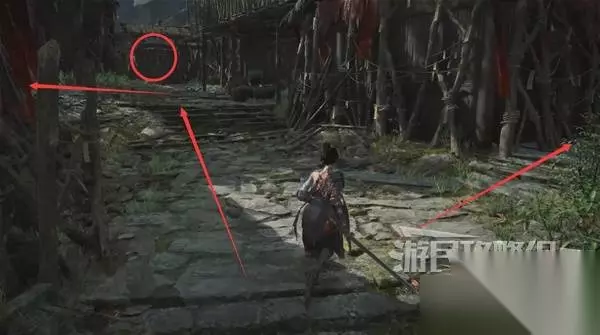 佛源镇-三步地 过河来到三步地,遇到年岁长年大侠,他告诉你那边房子(下图圈出位置)里有个脑袋带罐子的小孩。右边的路本来通往秽柳滩,但是着火了过不去。 走上阶梯就是去蜀王祠的路。年大侠要你去蜀王祠,为他兄弟拿药。说完他会给你【姿势】袍哥、【骨哨】。在蜀王祠打BOSS时,使用骨哨可以召唤年大侠帮你打。 我们先去右边路探索,等下再回来走上阶梯前往蜀王祠。