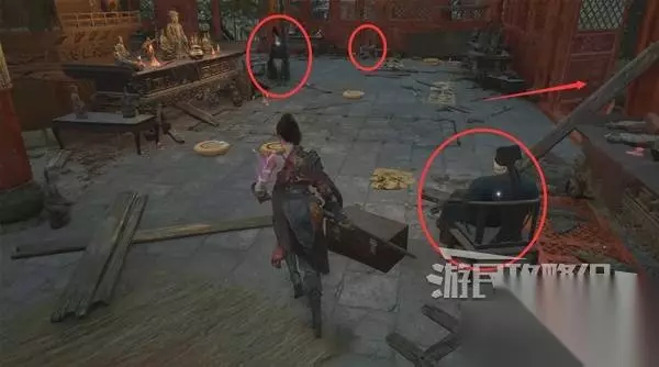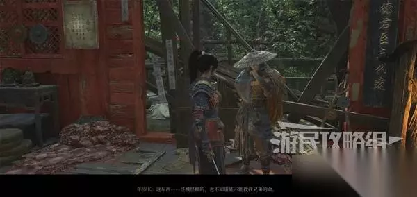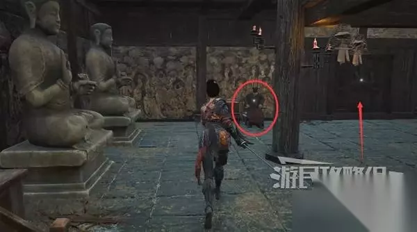 含光禅院神龛旁,扶起吴刚,对话得知他是头陀的手下。 下图右边是去打头陀的路,等下再去。 下图前方的房子里,打罐子怪可获得【黯淡红羽】。 下图左边的门,等打完头陀拿到禅院钥匙才能开。听敌人聊天,得知被抓来的两个小孩,大的跑了,小的脑袋掉了还死死抓着面人。