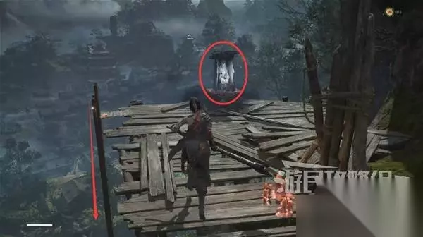 河上的断桥看似是断的,其实可以直接走过去。 用掷杯筊做过标记你就知道,断桥上的光点就是掷杯筊,是在告诉你这是隐形桥,可以直接走过去。