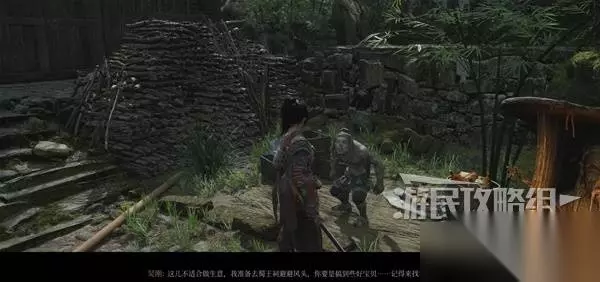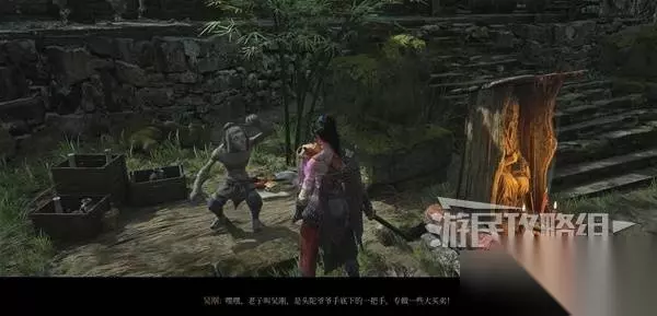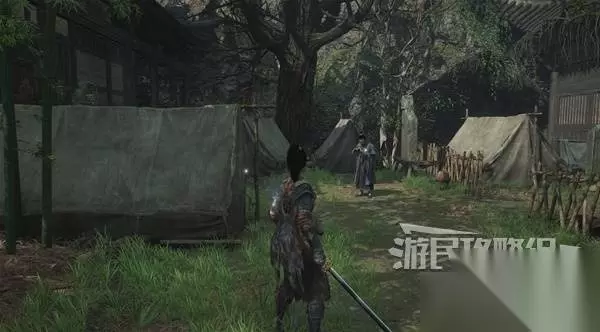 走下长阶梯来到寺院,看到院子中间一棵粗壮的大树,右拐和篝火旁坐着的老船夫对话,练习战斗。 被白克虏击败后,学习游戏的死亡和升级机制。