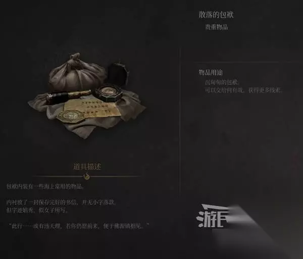 然后先不急离开,看旁边篱笆这里,草地里捡到【贵重物品】散落的包袱,等后面遇到何有哉时交给他。