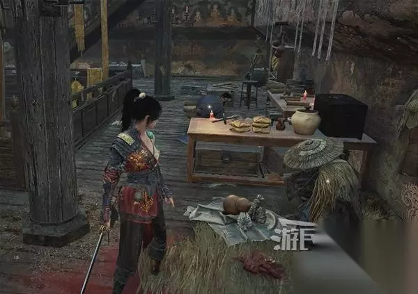 需要钥匙才能开的门旁边,听敌人聊天,得知被抓来的两个小孩,大的跑了,小的脑袋掉了还死死抓着面人。 一旁的桌子旁,捡到【穆桂英面人】。千万不要以为是普通道具就吃了,留着后面还有用。 旁边房子里,桌上拿到【黯淡红羽】。