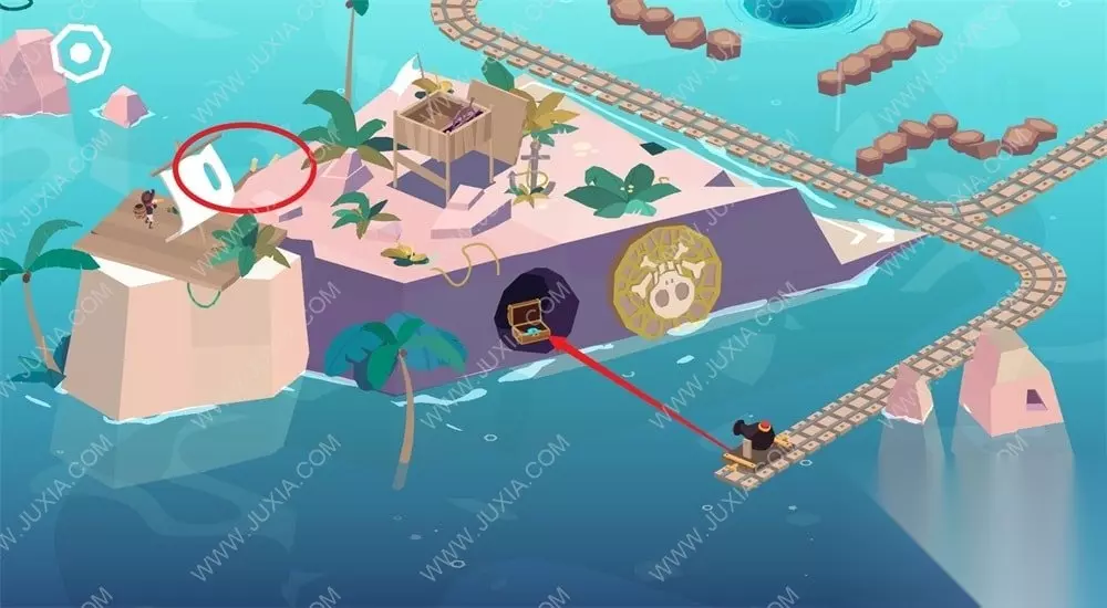 3.第三把蓝色钥匙在沉船岛,具体的位置如图所示,先打开左侧的圆盘,然后用炮塔将墙壁击碎,在宝箱内获得蓝色钥匙。3.1