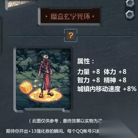 作为开魔盒中最期待开出的道具,强化券当然是少不了的了,整个强化券的背面是满怀记忆的格兰之森地图,卷轴打开便是一个卡包,用来携带日常的各种卡片。同时,强化券还有一个彩蛋,那就是如果你获得的强化券里面印着+12强化券、+13强化券、稀有装扮兑换券,那么你同时在游戏中也会真的获得一张+12、+13强化券、稀有装扮兑换券! 魔盒玄学光环