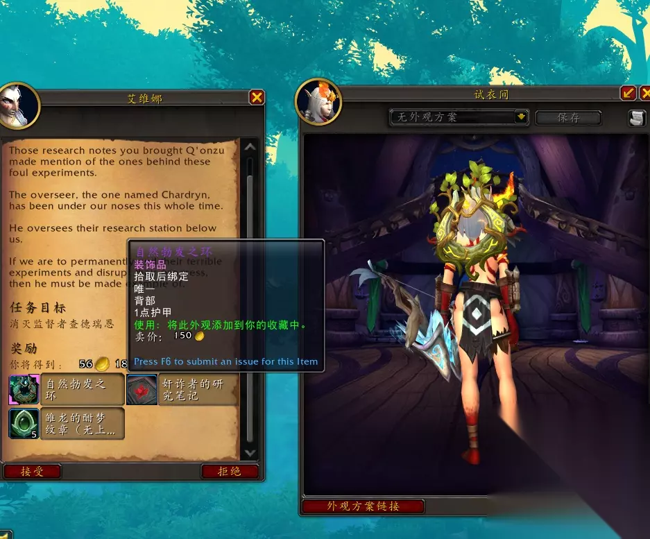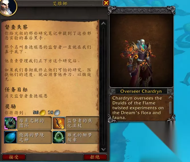 最终奖励:母亲之树的圆环(披风幻化)、奸诈者的研究笔记(250梦境守望者声望)、监督者的焦化法杖(750梦境守望者声望)、饱满的梦境之种、5个雏龙的酣梦纹章