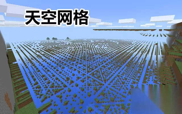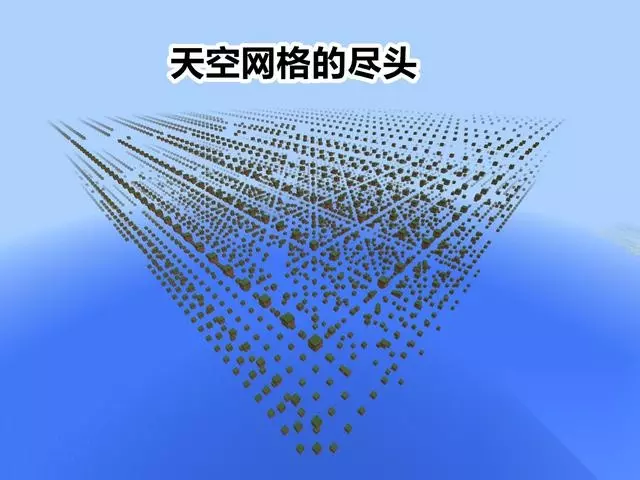 顺着边境之角继续向前,你会看到规则排列的“天空网格”。草方块将会不同寻常的以网格图形出现,没有任何实体可以站立在这些草方块上。也没有人知道为什么会产生如此奇怪的诡异现象。