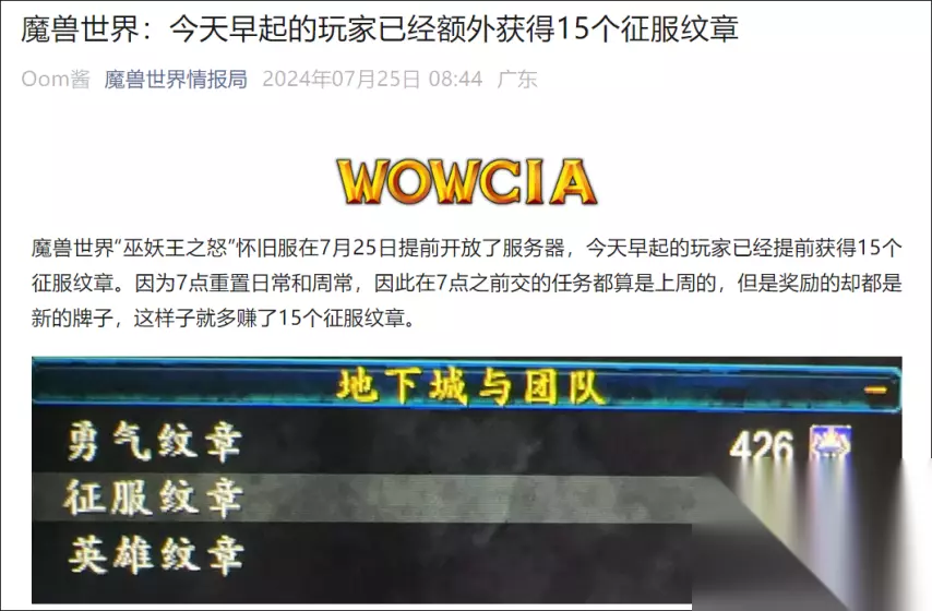 这样做可以比别人多拿15个牌子 最后小O给大家一个小窍门,有可能可以多拿15个寒冰纹章。为什么说有可能呢?因为这个方法的实现取决于ICC阶段更新当天国服的维护速度。 我们在ICC开放的前一周,打了周常之后先不交。在ICC开放的前一天,打了日常之后先不交。 如果国服在5月15日当天早上7点之前就开服,那么迅速交掉任务就可以拿到15个寒冰纹章,而且7点之后周常和日常刷新又可以再接。这个做法在国服去年7月份开放奥杜尔的时候就有大量玩家成功拿到往外的15个征服纹章。 不过如果国服当天维护时间较久,开服时间晚于7点钟,那这个做法就没有用了。