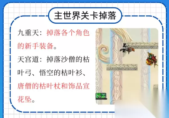 造梦西游3装备掉落大全 主世界关卡掉落 九重天:掉落各个角色的新手装备。这里是玩家开启游戏之旅的起点,新手装备虽然属性较为基础,但为后续的冒险打下了基础。 天宫道:掉落沙僧的枯叶弓、悟空的枯叶衫、唐僧的枯叶杖和饰品宣花坠。这些装备在游戏初期能为角色提供一定的属性加成,帮助玩家更好地应对后续的挑战。