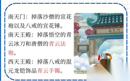 南天门:掉落沙僧的宣花袍以及八戒的宣花锤。宣花袍和宣花锤都是比较实用的装备,能提升角色的攻击力和防御力。 南天王殿:掉落悟空的青云冰刀和唐僧的青云法袍。青云冰刀和青云法袍具有较高的属性,能让悟空和唐僧在战斗中更具优势。 西天王殿:掉落八戒的混元龙铠以及饰品青云手镯。混元龙铠为八戒提供了强大的防御力,青云手镯则可以增加角色的属性。