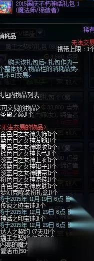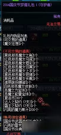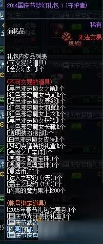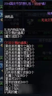 DNF2016国庆套称号:每一年的国庆套都是年度的最大卖点,因为国庆套的东西多,价格便宜!除了一套国庆套装以外还有很多值钱的东西呢,14年的338国庆有宝珠,光环,称号,国庆邀请函,这些在游戏里价值都超过了多少个亿!15年的国庆套也差不多,反正,能够买一套最贵的国庆套,绝对是大赚的! 我们先来回顾2014年国庆套: 称号:【魔女幻想】,属性超级给力,游戏里最低1个亿