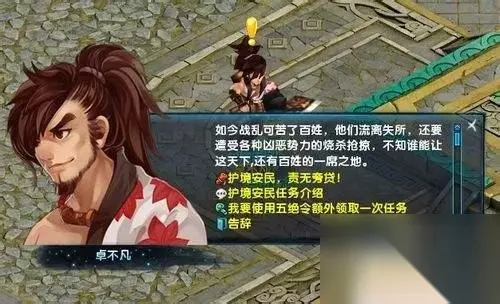 6.护境安民:等级达到35级即可到临安找到护境安民任务使NPC卓不凡领取任务,任务十分简单,打败50个怪物即可,这些怪物还是有要求的,必须不低于玩家等级5级的怪物。每周可以领取五次该任务。每完成一轮任务,将会获得相应经验和五绝令。
