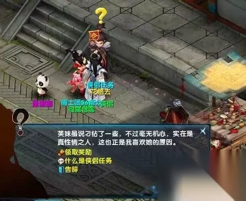 4.侠侣任务:当你的等级大于等于25的时候,你就可以去临安找NPC“花落去”。领取侠侣任务了,前提是你必须组队领取,领取后会随机接到一个小任务,完成后必须两人交付任务方可领取奖励。