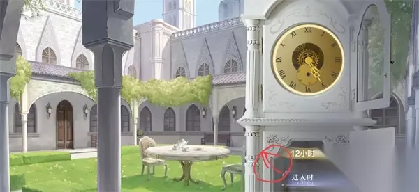3、然后将指针拨到12小时前,在木门【转动把手】,离开花园。