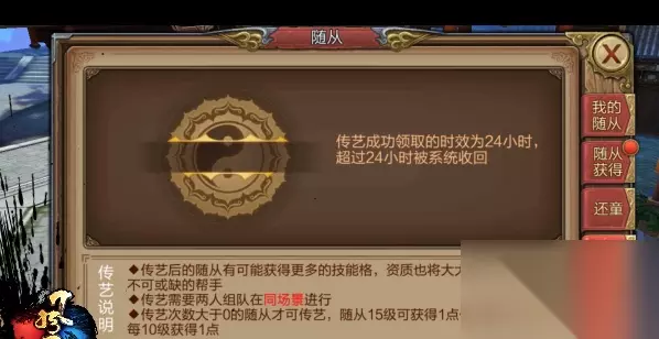通过一些渠道或者商城购买可以获得还童卷轴。还童通过将指定随从由原来等级变为1级从而改变它的成长率。还童只能对成年和幼年未传艺过的随从进行,变异的或者是传艺过的,都不能还童。(PS:目前只有人形态的随从可以还童,带有金框的圣兽无法还童。还童卷轴有低级和高级低级对55级以下随从用,高级对55以上随从用。) 2、随从传艺