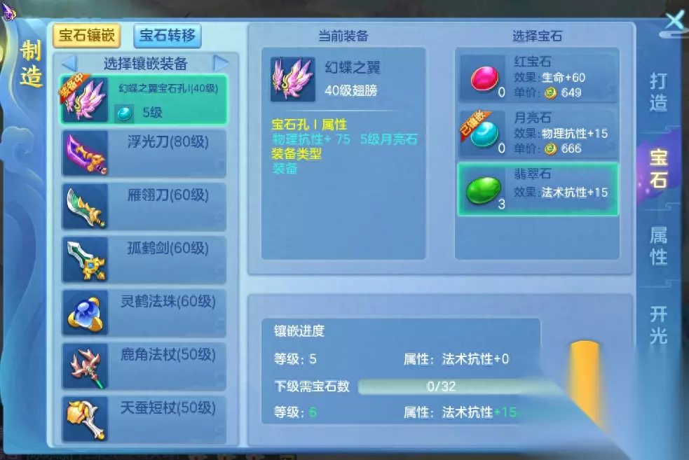 其实以上说到的翅膀方面的提升以外,翅膀也是可以像装备一样镶嵌宝石,同时提升我们人物战力的,而翅膀镶嵌方面则需要根据人物职业或是常用场景来选择不同的宝石,通常可镶嵌在翅膀上的宝石都是偏向防御的,例如可提升物抗的月亮石、可提升法抗的翡翠石,各位小伙伴自行选择即可。