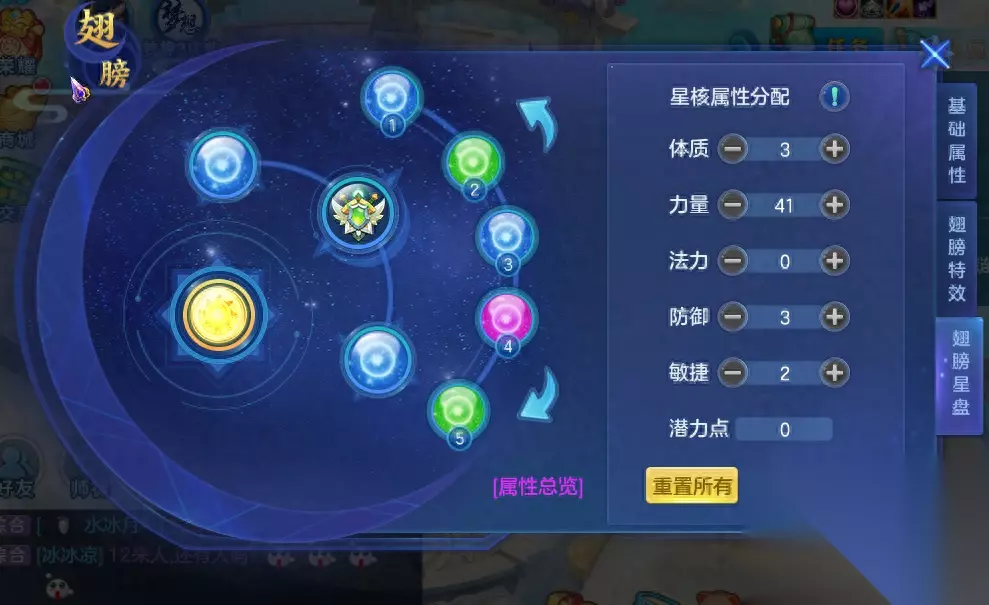 首先是翅膀强化。翅膀强化可以对我们的整体属性进行提升,随着强化等级的提高,属性也会随之升高,目前哼唧的三个属性都升级到了19级这个等级,伤害、速度属性方面能够提供92的加成,而生命则有着592的提升,还是非常可观的。所以当我们拥有飞翔之羽的时候,可以优先用来提升属性强化的等级。此外,翅膀隔强化等级达到对应的上限时,还可以激活翅膀光效,在外观上有着非常不错的效果。 接着是翅膀星盘,翅膀星盘是一个可以提升我们人物生命、伤害、物穿、法穿、速度、物抗、法抗属性的东西,我们可以通过分配进阶翅膀所获得的潜力点在不同星核上以提升对应的属性。星盘总共分为三项,分别是主星核、星盘核心、其他星核,玩家只需要根据自己的职业来分配潜力点在不同的星核上即可,如果你对潜力点分配的不满意,也可以通过“飞翔之心”来进行重置。