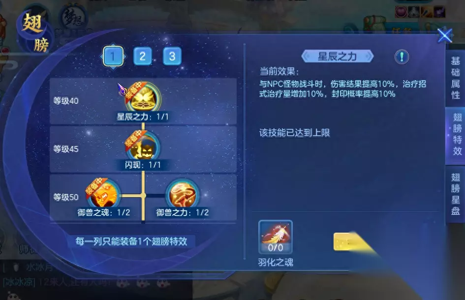最后是翅膀特效。从40级开始,每5级玩家都可以学习装备特效,而整体的翅膀特效是以树状分布的,每个翅膀特效都有其不同的效果,比如这个40级的翅膀特效“星辰之力”,就是提高与怪物战斗时的伤害结果,同时提升治疗招式的治疗量等,非常适合前期清日常,而等级越高时,可学习的翅膀特效的用处就越大,若碰到分支处,玩家可以根据需求来选择解锁。