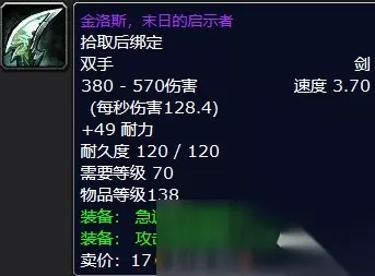 :双手剑 :史诗 :拾取后绑定 :武器 伤害:380-570 速度:3.70 (每秒伤害:128.4) +49耐力 耐久度:120/120 需要等级:70 物品等级:138 装备:急速等级提高45。 装备:攻击强度提高120点。 :祖阿曼副本BOSS祖尔金(8.3%掉落率)。