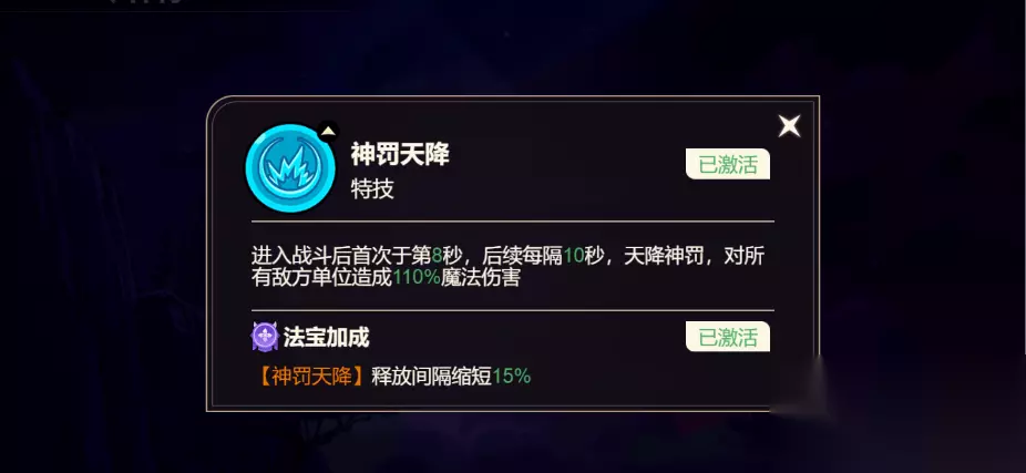 神罚天降 进入战斗后首次于第8秒,后续每隔10秒,天降神罚,对所有敌方单位造成110%魔法伤害