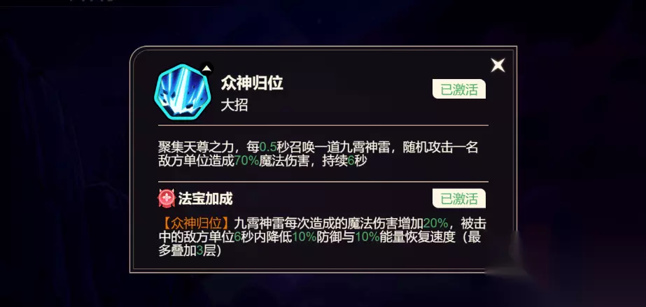 技能天赋 众神归位(大招) 聚集天尊之力,每0.5秒召唤一道九霄神雷,随机攻击一名敌方单位造成70%魔法伤害,持续6秒