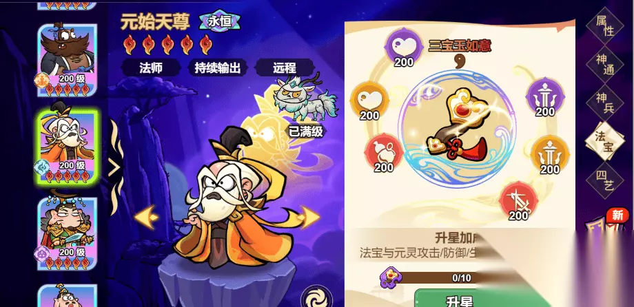 法宝:三宝玉如意 强化:法宝强化有6个属性分别是:生命元灵,攻击元灵,生命元灵,攻击元灵,抗性元灵。暴击元灵强化会随着神将的等级进行开启。 强化材料获取途径:稀有元石,传说元石,神话元石,可通过法宝祈愿等活动进行获取。 升星:可提升法宝与元灵攻击/防御/生命:5%的属性加成。