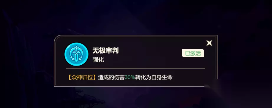 无极审判 【众神归位】造成的伤害30%转化为自身生命