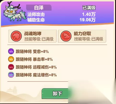 灵兽:白泽 战魂咆哮:每3秒增加自身1.7%攻击与1.7%防御,最多叠加10层 能力窃取:进入战斗后随机偷取一名敌人25%攻击,效果持续15秒(偷取的攻击力最多不超过自身的35%) 元始天尊携带白泽的又是,可让天尊不断对自身攻击伤害进行叠加,并且偷取敌人的攻击力,再使用自身0.4秒的技能可对敌人造成大量的伤害。